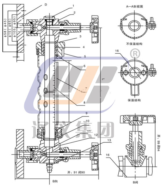 9.壓蓋螺母 10.底環(huán)‖ 11.鋼球 12.下閥 13.排污接頭 14.保溫管 15.平焊法蘭 16.標(biāo)牌